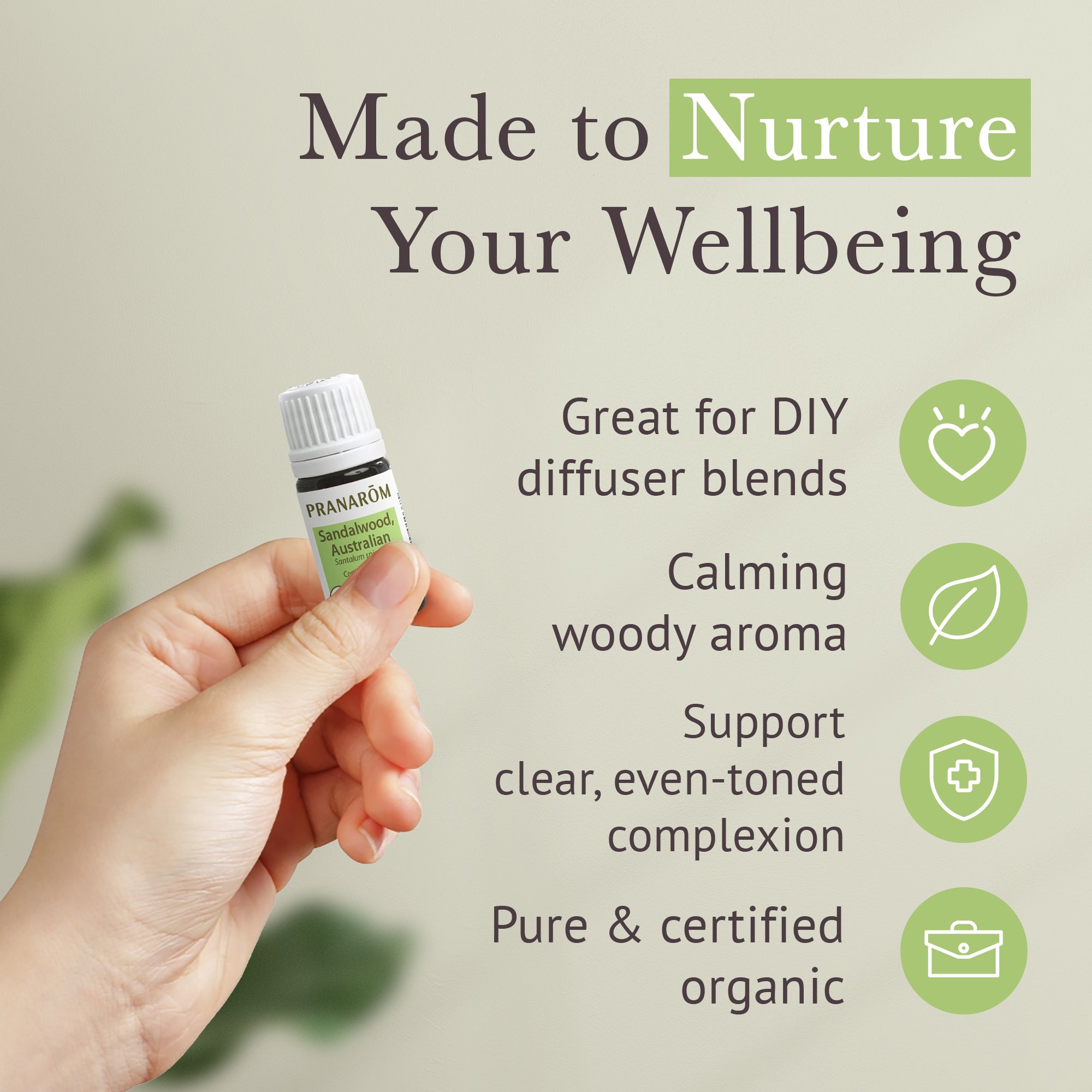 5 ml - OrganicA smooth and sweet woody oil that is deeply balancing where healthy stress response, skincare and overall health are concerned. 100% pure, certified organic Santalum spicatum essential oil from Australia.