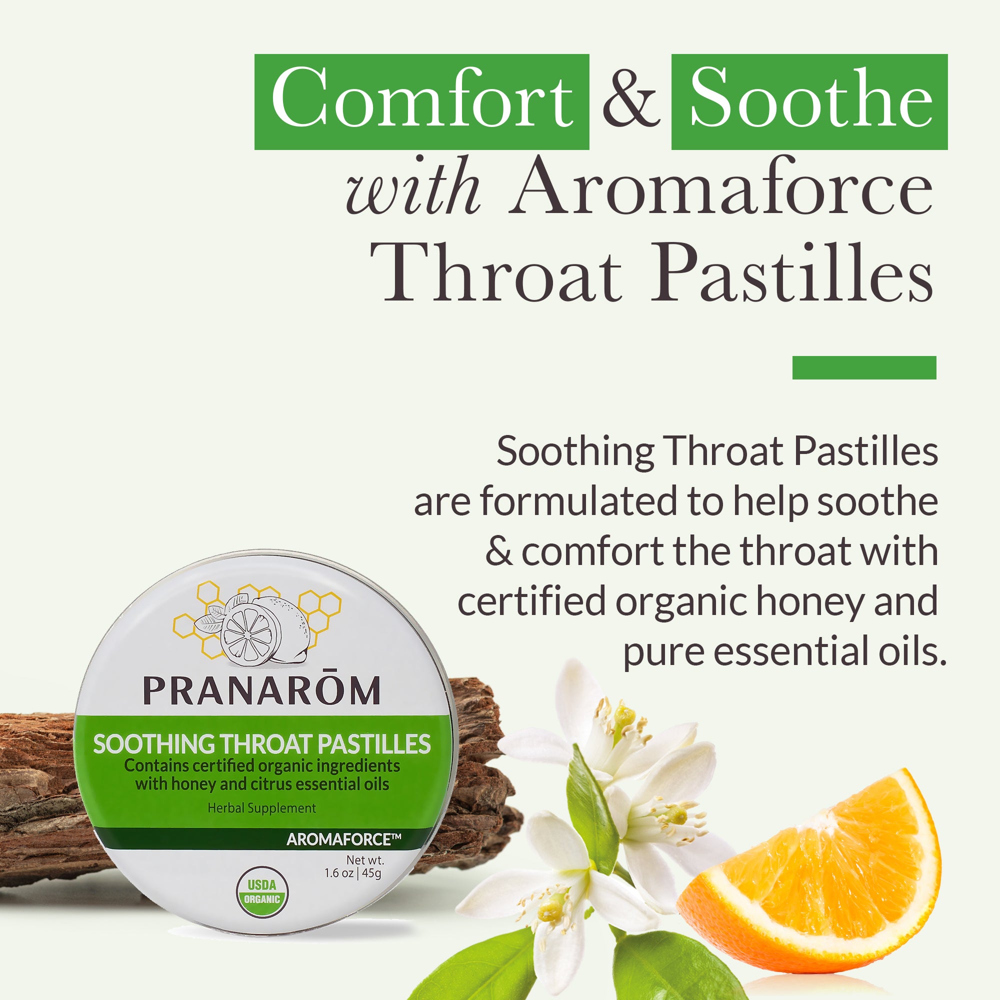 Our Aromaforce Soothing Throat Pastilles are formulated to help soothe and comfort the throat with certified organic honey and pure essential oils. A delicious remedy for at home or on-the-go! Read more