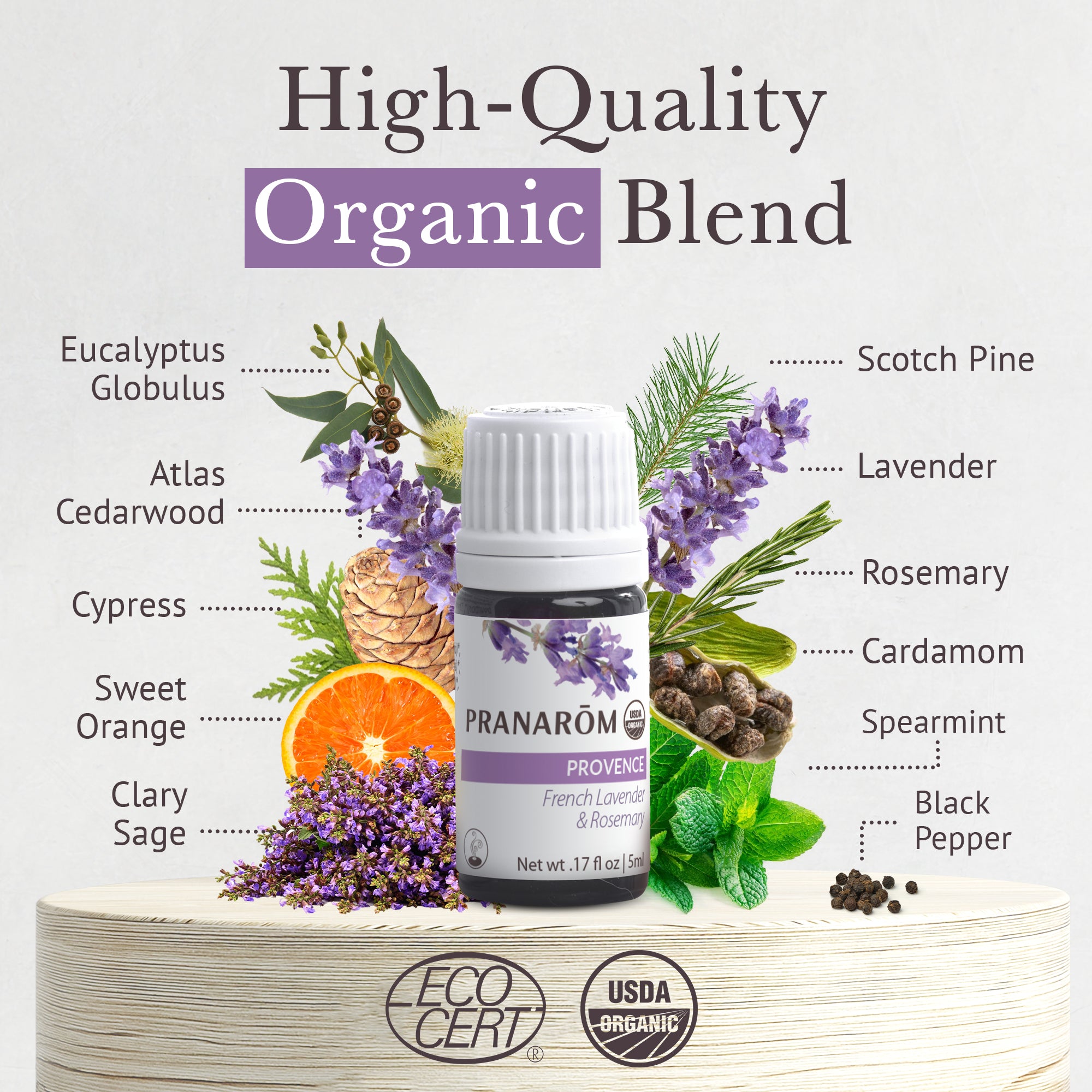Provence features fresh notes of Lavender and Rosemary blended with the warm, woody scent of Mediterranean Cypress. One of our six diffusion blends created in Grasse, France. 100% pure, certified organic essential oils. Read more